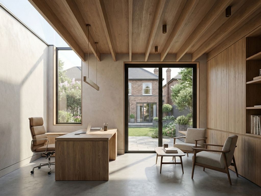 This project converted an old garage space into a light, airy garden outbuilding for an office space. Large glazing, exposed timber rafters, and a continuous rooflight fill the interior with natural light and frame garden views. A sleek metal-framed door in light grey brickwork forms a contemporary façade, complemented by a dark grey bench. The design combines sim